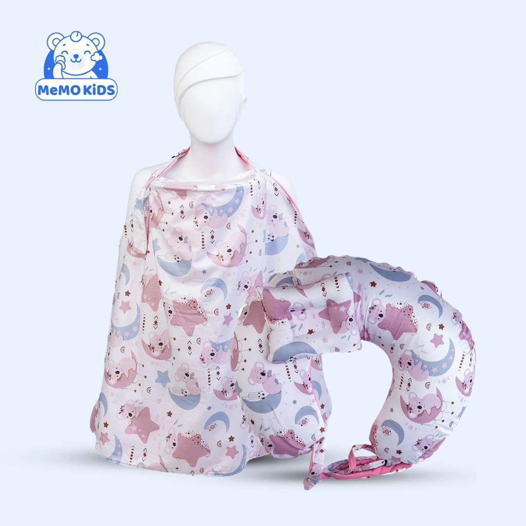 مخدة وساتر رضاعة بتصميم دبدوب لون بينك