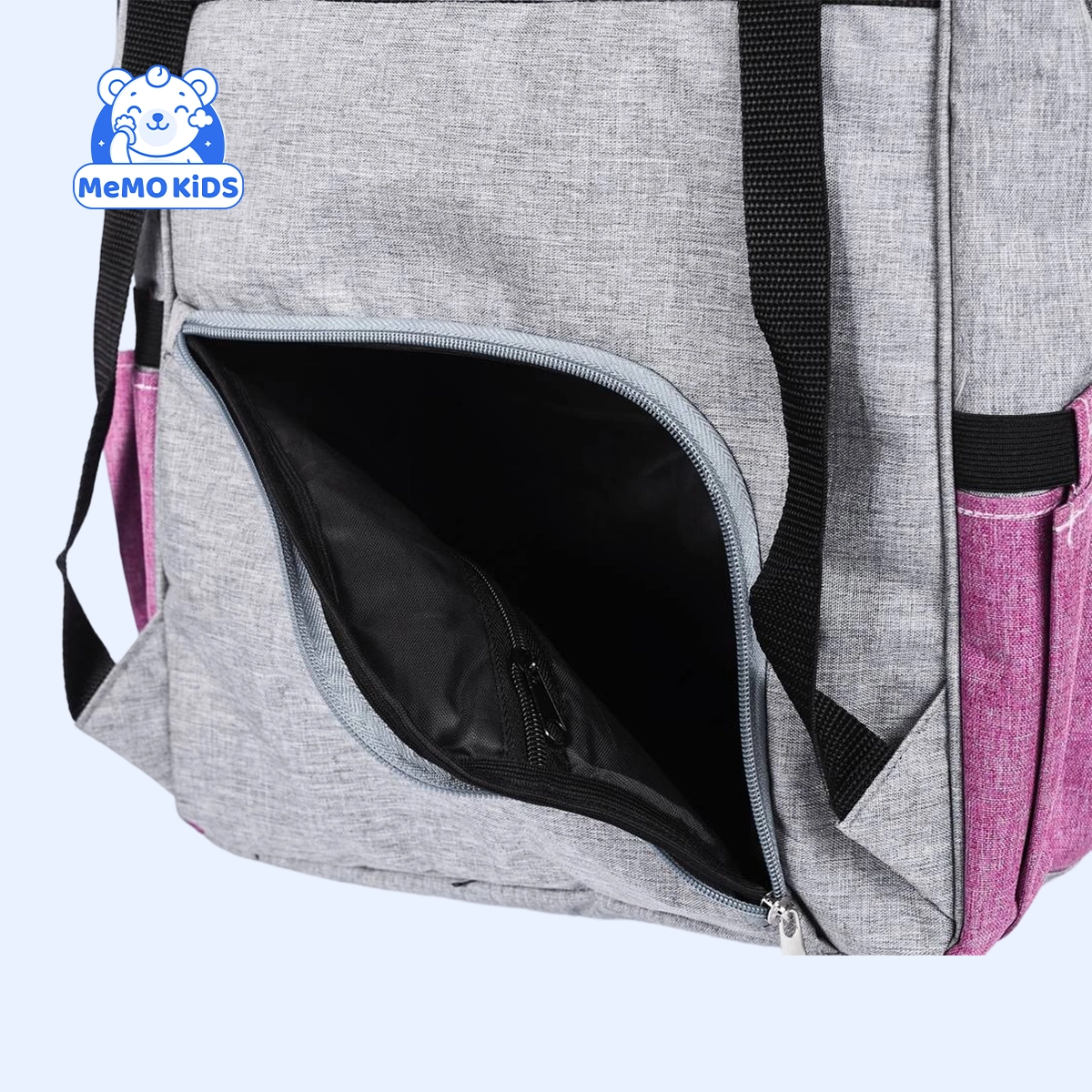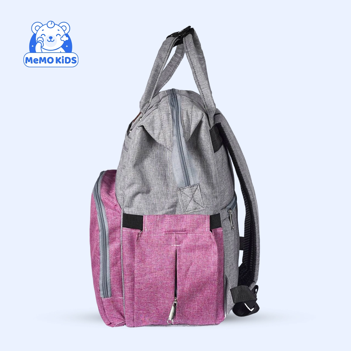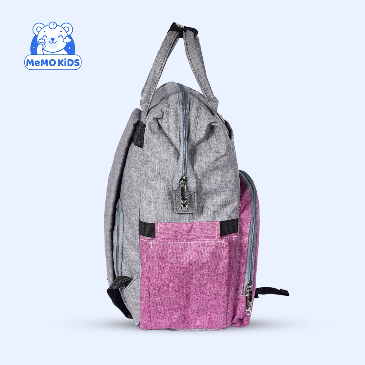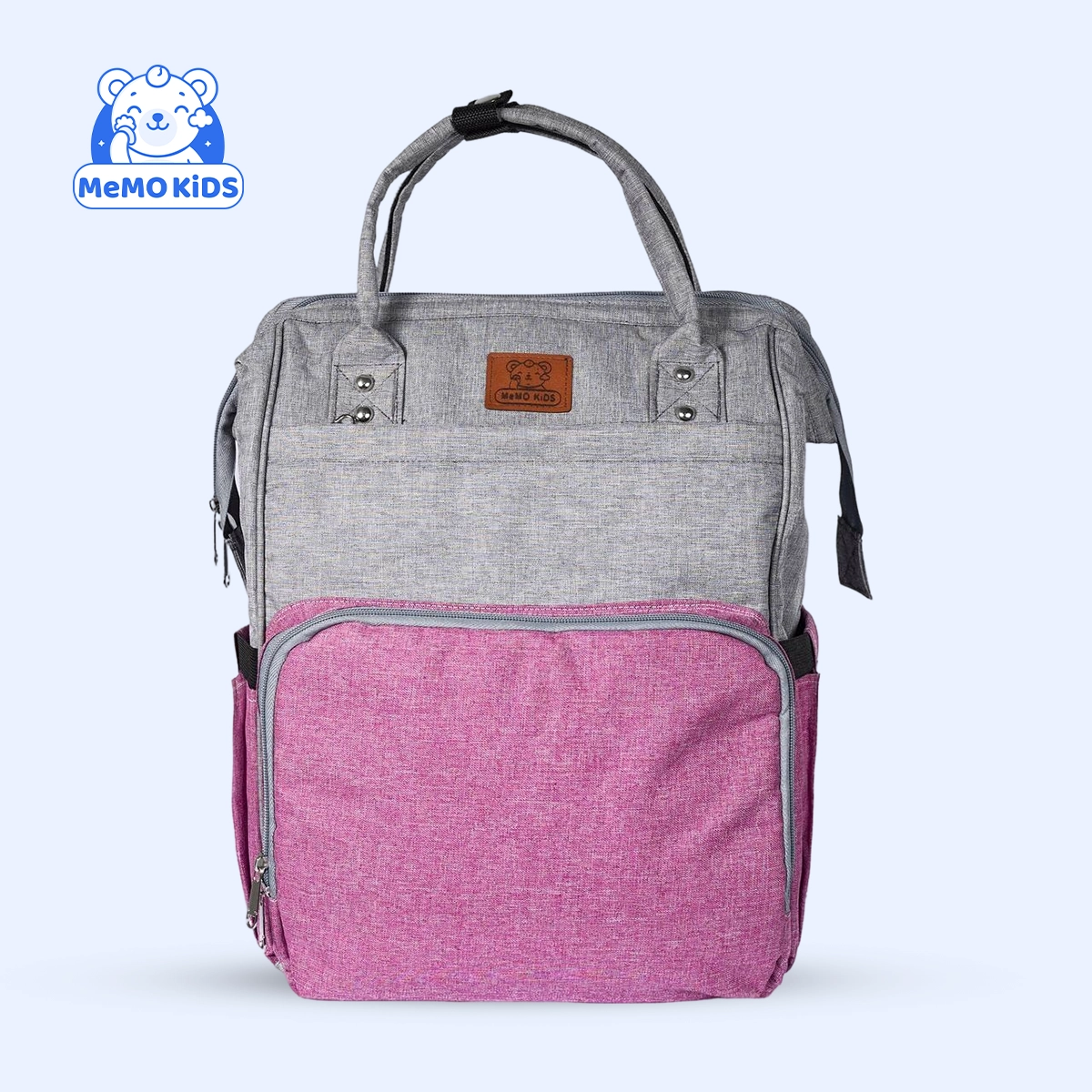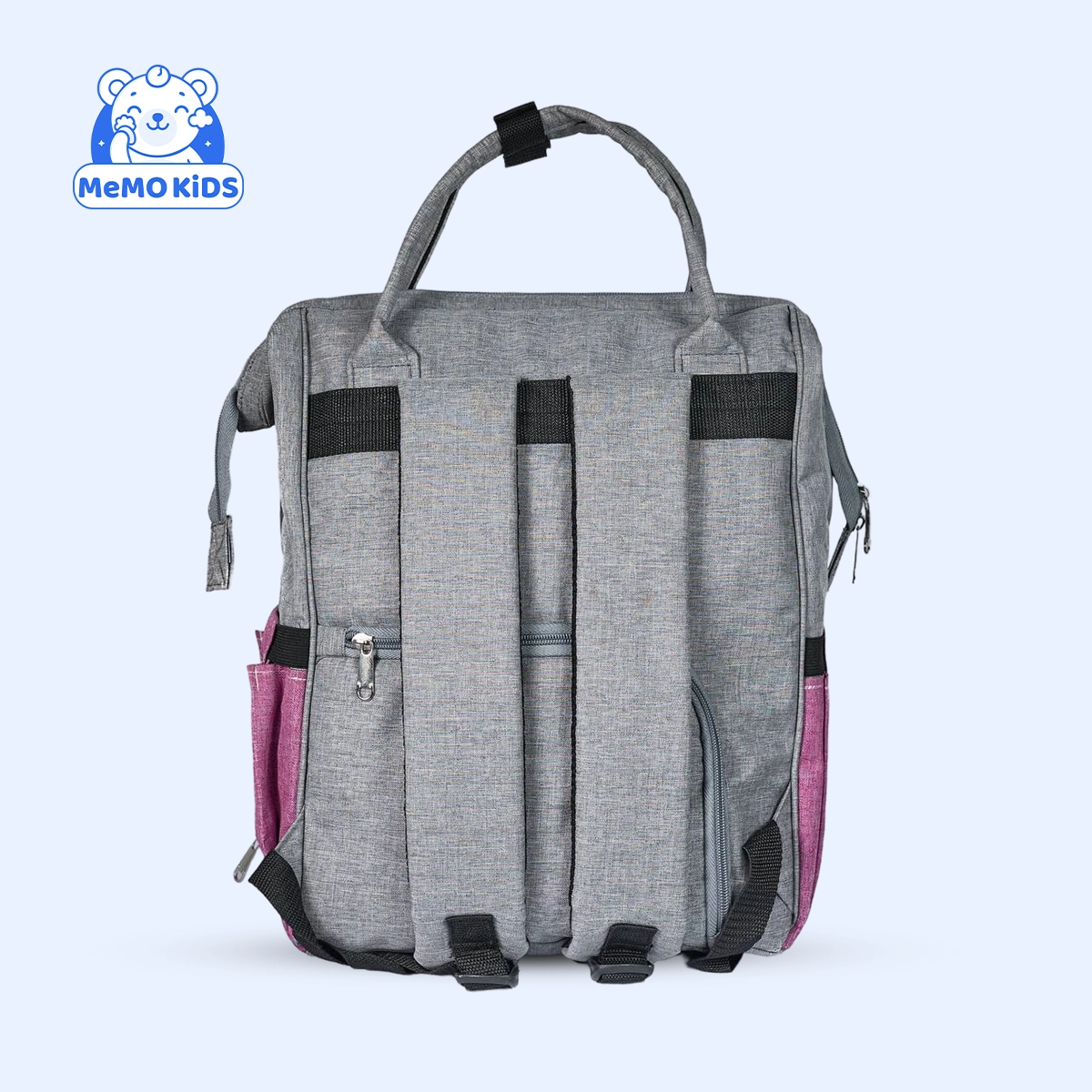شنطة ماميز متعددة الاستخدام باللون الرمادي مع بينك، تصميم أنيق يجمع بين العملية والعصرية لتناسب احتياجات كل أم أثناء الخروج مع طفلها.