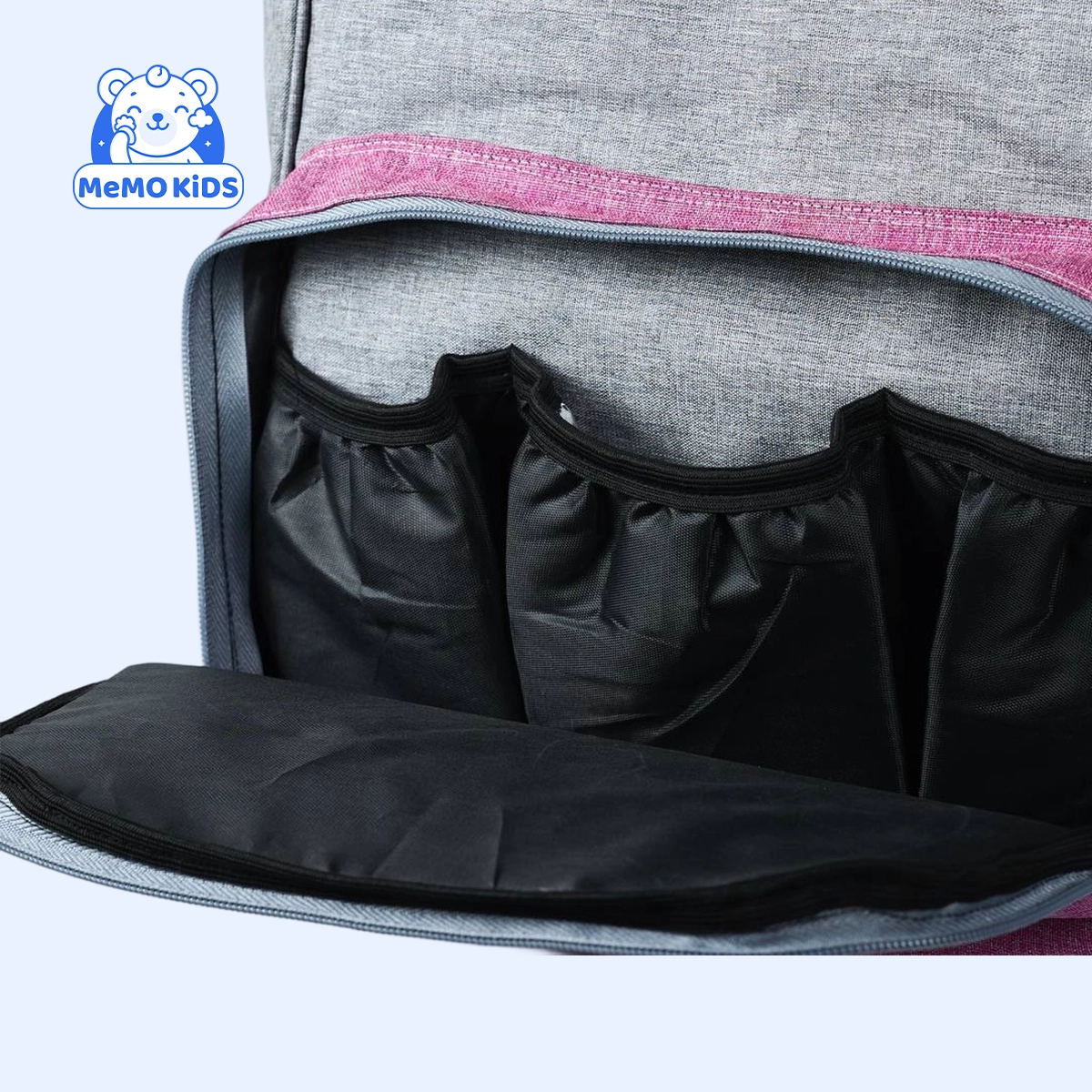توفر الشنطة مساحة داخلية واسعة تساعدك على تنظيم جميع مستلزمات الطفل مثل الحفاضات، الملابس، الرضّاعات، والمناديل، مع تقسيمات داخلية ذكية تسهّل الوصول لكل الأغراض بسرعة وبدون فوضى.