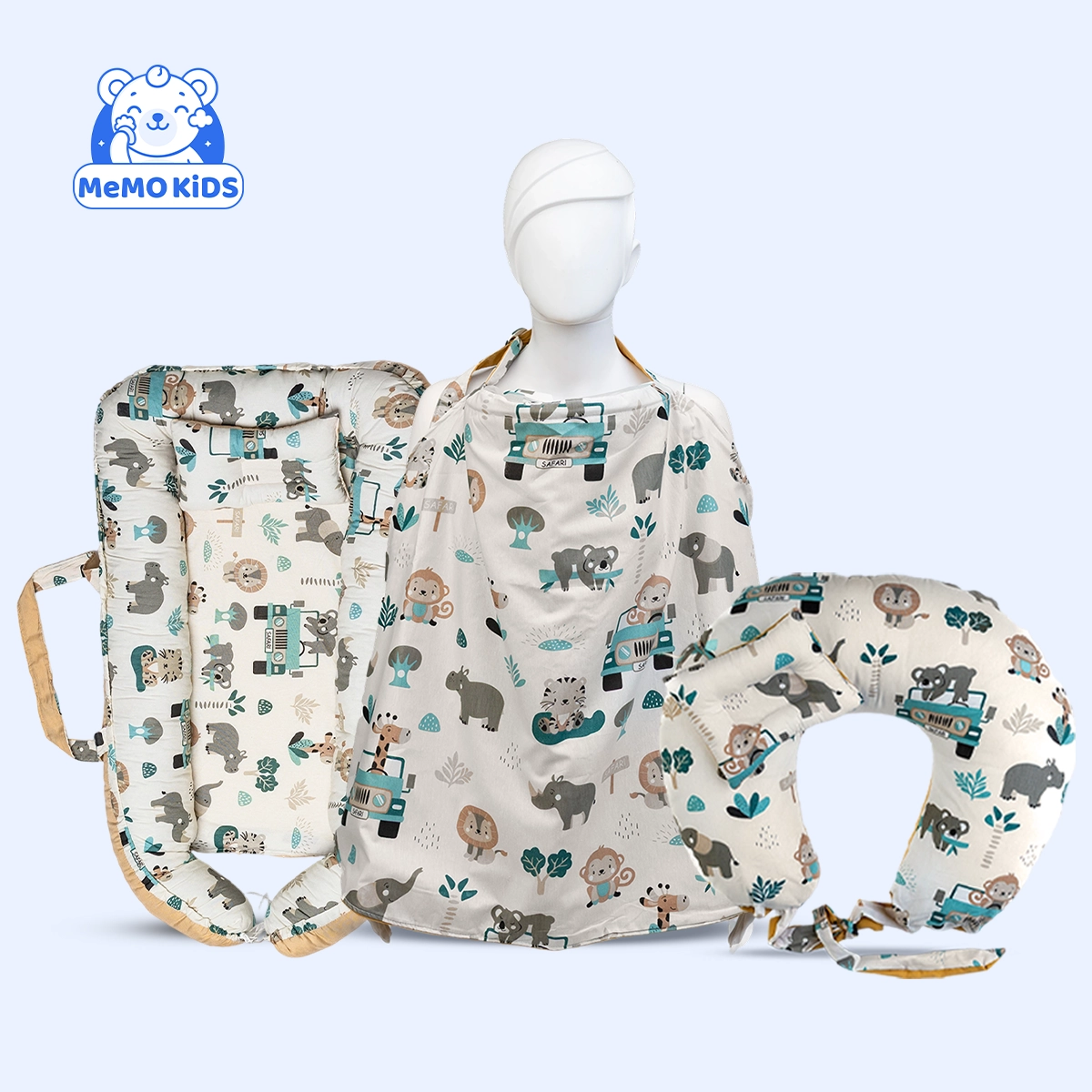 منتج متكامل يضم مخدة وساتر رضاعة وسرير بيبي نست بتصميم حيوانات ولون بيج، مصمم لتوفير راحة ودعم كامل للأم، مع خلق بيئة هادئة وآمنة للبيبي أثناء الرضاعة والنوم.
