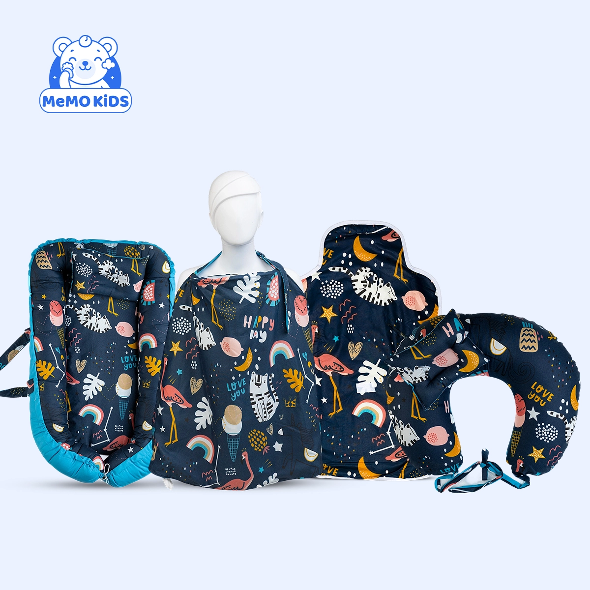 المجموعة مصنوعة من خامات ناعمة وآمنة على بشرة الطفل وسهلة التنظيف، مما يجعلها مناسبة للاستخدام اليومي وتوفر راحة للأم والبيبي أثناء الرضاعة والنوم.