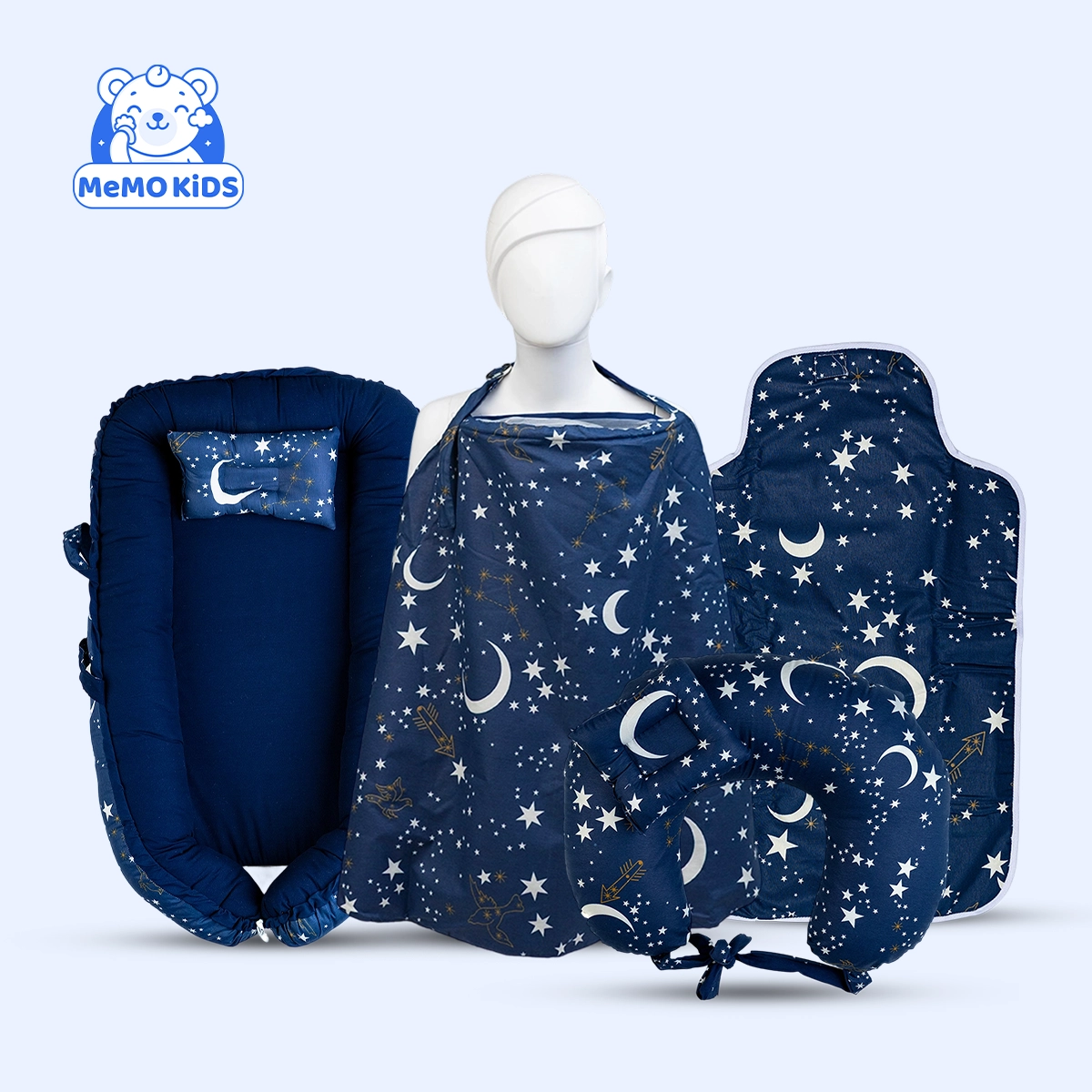 مجموعة رضاعة ونوم للبيبي بتصميم هلال ولون كحلي، صُممت لتكون من أهم مستلزمات حديثي الولادة التي تساعد الأم على إرضاع طفلها براحة أكبر وتوفر للبيبي مكانًا مريحًا وآمنًا للنوم والاسترخاء.