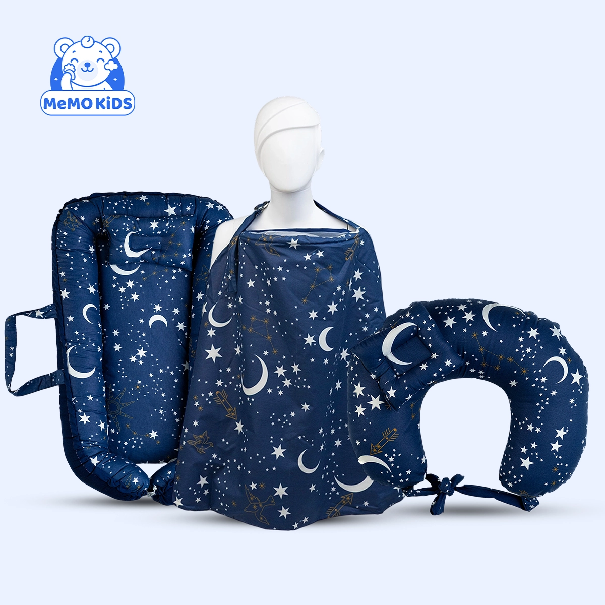 المخدة تساعد على تثبيت البيبي في وضعية مريحة وصحية أثناء الرضاعة، الساتر يمنح الخصوصية والحماية أثناء الرضاعة في المنزل أو أثناء التنقل، وسرير البيبي يوفر مساحة نوم مستقرة وآمنة بعد الرضاعة. تصميم الهلال الأنيق يضفي لمسة هادئة وراقية على غرفة البيبي، واللون الكحلي يمنح شعورًا بالسكينة والفخامة.