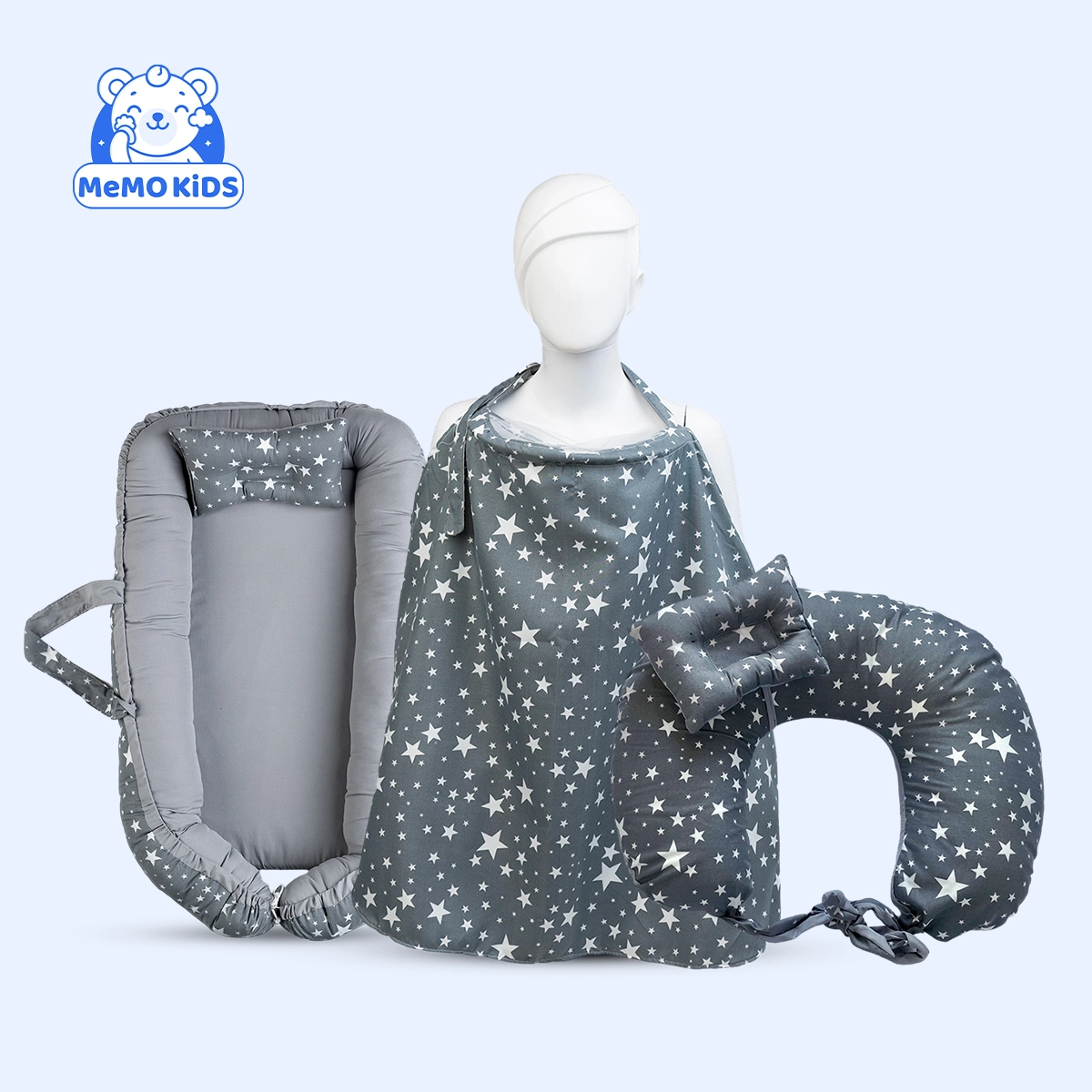مجموعة مخدة وساتر رضاعة وسرير بيبي بتصميم نجوم ولون رمادي، مصممة لتوفير أقصى درجات الراحة والدعم للأم، مع خلق بيئة هادئة وآمنة للبيبي أثناء الرضاعة والنوم.