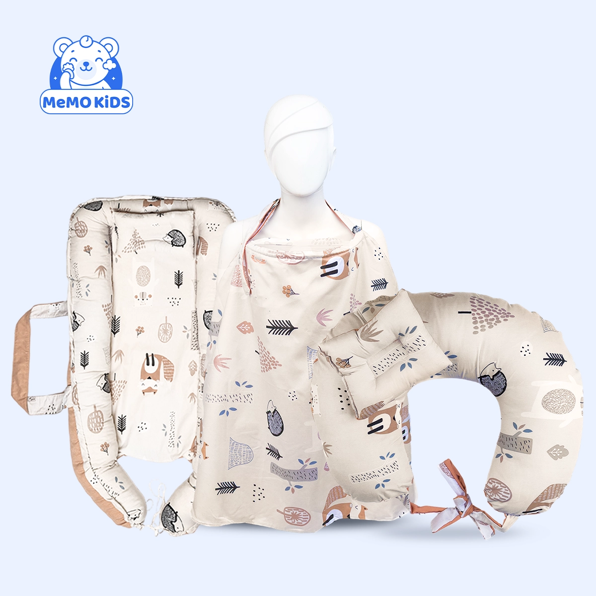 منتج متكامل يضم مخدة وساتر رضاعة وسرير بيبي نست بتصميم قنفد ولون بيج، مصمم لتوفير أقصى درجات الراحة والدعم للأم، مع خلق بيئة هادئة وآمنة للبيبي أثناء الرضاعة والنوم.